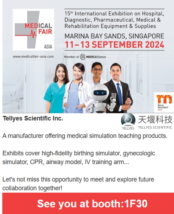Tellyes Scientific will participate in the Medical Fair Asia 2024 exhibition held in Singapore from September 11th to 13th! At that time, we will bring the latest exhibits to showcase our latest technology and achievements in the field of medical simulation equipment. We sincerely invite you to visit our booth and have a face-to-face communication with us to explore the infinite possibilities of future cooperation. Your presence will be our great honor!